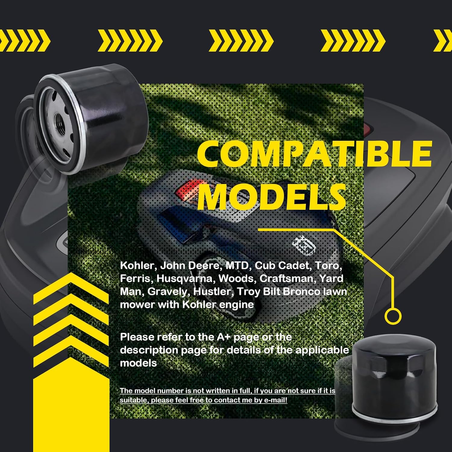 1205001S Oil FilterReplaces OEM Numbers: Ariens: 08200204, 12 050 01-S1, 21397200Bobcat: 842502Craftsman: 24604Cub Cadet:12 050 01-S, 12 050 01-S1, CC-12-050-08, KH-12-050-01-S, KH-12-050-01-S1, KH-12-050-08Ferris: 5021144X1, 5021144X1SMGravely: 21397200Husqvarna: 531307393Hustler: 747303John Deere: AM119567, AM125424, GY20577, KH01205008, LG4153, LG492932S, M139118Kohler: 12 050 01, 12 050 01BP, 12 050 01-S, 12 050 08, 1205001, 1205001S, 12 050 01-s, 12-050-01-s, 1205001, 1205008, KH1205008,12-050-01, 12-050-01-S1, 1205001S1, 1205001-S1, KH1205001S, KH1205001S1, 12-050-08Kubota: E7188-32110Lesco: 032009Toro: 12 050 01-S, 98020, 120-523Woods: 70820Compatible ModelsKohler: KT715, KT725, KT730, KT735, KT740, KT745, CH11-CH16, CH18-CH26, CH410-CH450, CV11-CV26, CV430-CV495, SV470-SV620, CH730-CH745, CV730-CV745, SV710, SV715, SV720, SV730, SV735, SV740, XT1 Enduro Series, Troy Bilt Riding Lawn Mower, LTX1050, 24 HP KT-735, LT-54 mowerJohn Deere: 115, 125, 135, 145, 316, 317, 1200 Hydro, 155C, 190C, 636M, 648M, 648R, 652B, 652E, 652M, 652R, 652R MOD, 657A, 661R, 661R EFI, 667A, 7G18, 800 Aerocore, D100, D105, D110, D120, D125, D130, D140, D150, D155, D160, D170, E100, E110, E140, F620, F680, F687, G100, G15, Gator XUV 550, Gator XUV 550 S4, Gator XUV 560, Gator XUV 560 S4, GATOR XUV560E, GATOR XUV560E S4, GS30, GT225, GT235, GT235E, L100, L108, L110, L111, L118, L120, L130, LA105, LA110, LA115, LA120, LA125, LA130, LA135, LA140, LA145, LA150, LA155, LA165, LA175, LT133, LT150, LT155, LT160, LT166, LT170, LTR155, LTR166, LX173, LX255, LX266, LX288, M655, M665, S240, Skid Steer Loader 60, SST15, SST16, SST18, STX38, STX46, WG32A, WG36A, WG48A, WG52A, WH36A, WH48A, WH52A, WH61A, WHP36A, WHP48A, WHP52A, WHP61A, X110, X120, X125, X130R, X140, X145, X155R, X165, X300 WITH ENGINE MARKED FS541V- FS600V, X300R WITH ENGINE MARKED FS541V- FS600V, X304 WITH ENGINE FS541V, X310, X320 WITH ENGINE MARKED FS651V-, X324 WITH ENGINE FS651V, X330, X350, X350R, X354, X360 WITH ENGINE MARKED FS651V (SN# 150001- ), X370, X380, X384, X390, X394, X500 WITH SN# 060001, X530 WITH ENGINE MARKED FS730V-, X534 WITH ENGINE ENGINE MARKED FS730V-, X570, X580, X584, X590, Z225, Z235, Z245, Z255, Z335E, Z335M, Z345M, Z345R, Z355E, Z355R, Z375R, Z425, Z435, Z445, Z465, Z510A, Z520A, Z525E, Z535M, Z535R, Z540, Z540R, Z625, Z645, Z655, Z665, Z710A, Z720A, Z910A, Z915B, Z915E, Z920A, Z920M, Z920R, Z925A EFI Pro, Z925M, Z925M EFI, Z925M EFI Flex Fuel, Z930M, Z930M EFI, Z945M EFI, Z955M EFIToro: 74610, 74603, 74701, 74702, 79104, 74255, 74261, 74262, 74263, 74282, 74283, 74284, 74291, 74412, 74414, 98020, 30178, 30179, 30316, 30317, 30318, 30319, 30433, 30527, 30528, 30529, 30530, 30612, 74239, 74244, 74256, 74292Craftsman: 24604, LT1000,CC1205008, GT5000, GT5600, PYT9000, PGT9000, ZTL7000, Z6000, Z6400, Z4800, Z5200, YT4000, YT4500, 42 inch mowerCub Cadet: KH-12-050-01-S, CC-12-050-08, 1500 series, 2000 series, XT1 series, XT2 seriesFerris: 1000Z, IS2000Z, IS3000Z, IS3100ZHusqvarna: YTH20K46, YTH21K46, 5313073-93, 531307393MTD: 17-Z-SeriesHustler: X-One, RaptorWoods/Gravely/Troy Bilt Bronco: With Kohler enginesFunctionDirty or clogged oil filters can lead to lack of engine power and starting difficulties, at which point the oil filter should be replaced in a timely manner to extend the life of the engine.QualityMade of high quality material, high filtration efficiency, large dirt-holding capacity, good sealing and strong compatibility.Simple InstallationWear work gloves to protect your hands when installing this part.