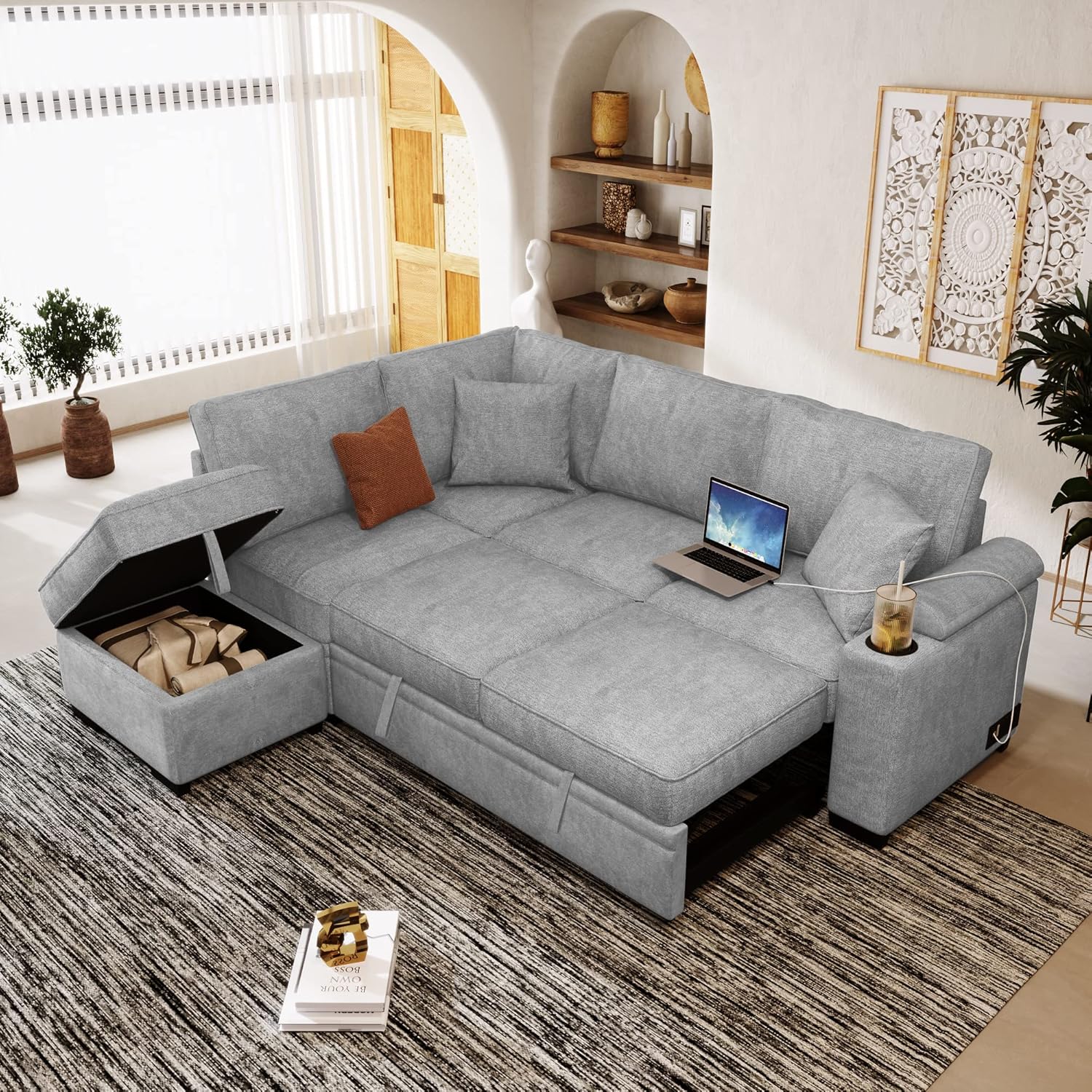 ✦Flash point:【Easy Convert Into A Bed】The folding sleeper couch can easily pull it out to as an sofa bed for unexpected guest or visitors. No more worrying about your friends not having a place to sleep!【Sturdy Frame】The Modern elegant sofa bed is based on a durable plywood frame which can bear 1000 lbs,filled with high-density foam, and is upholstered with polyester fiber. The modern style matches any room perfectly, adding an elegant atmosphere.【Ottoman with Storage】Hidden storage to reduce mess, the ottoman provides storage space for organizing toys, sheets, pillows, blankets or magazines neatly.【Suitable for Any Scene】The couch bed is in fashionable style and simpe outlook which is perfect for living rooms,bedroom,apartment,and guest rooms,etc!Weight & DimensionsOverall Dimension: Sofa Size: 84"D x30.1"W x 33.5"H, Bed Size: 84"D x 54.7"W x 33.5"HWeight Capacity: 1000 lbs (453 kg)Assembly Required: About 60 MinutesUpholstery Material: LinenFrame Material: PlywoodSeat Construction: Pocket Spring+FoamLeg Material: PlasticRemovable Backrest: YesRemovable Backrest Cover: YesRemovable Cushion: NoRemovable Cushion Cover: NoFoam Density: 1.6 lbs./cu.ftSet Includes: Sofa Bed+Ottoman
