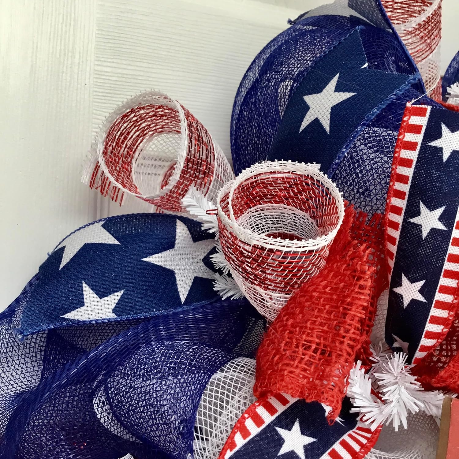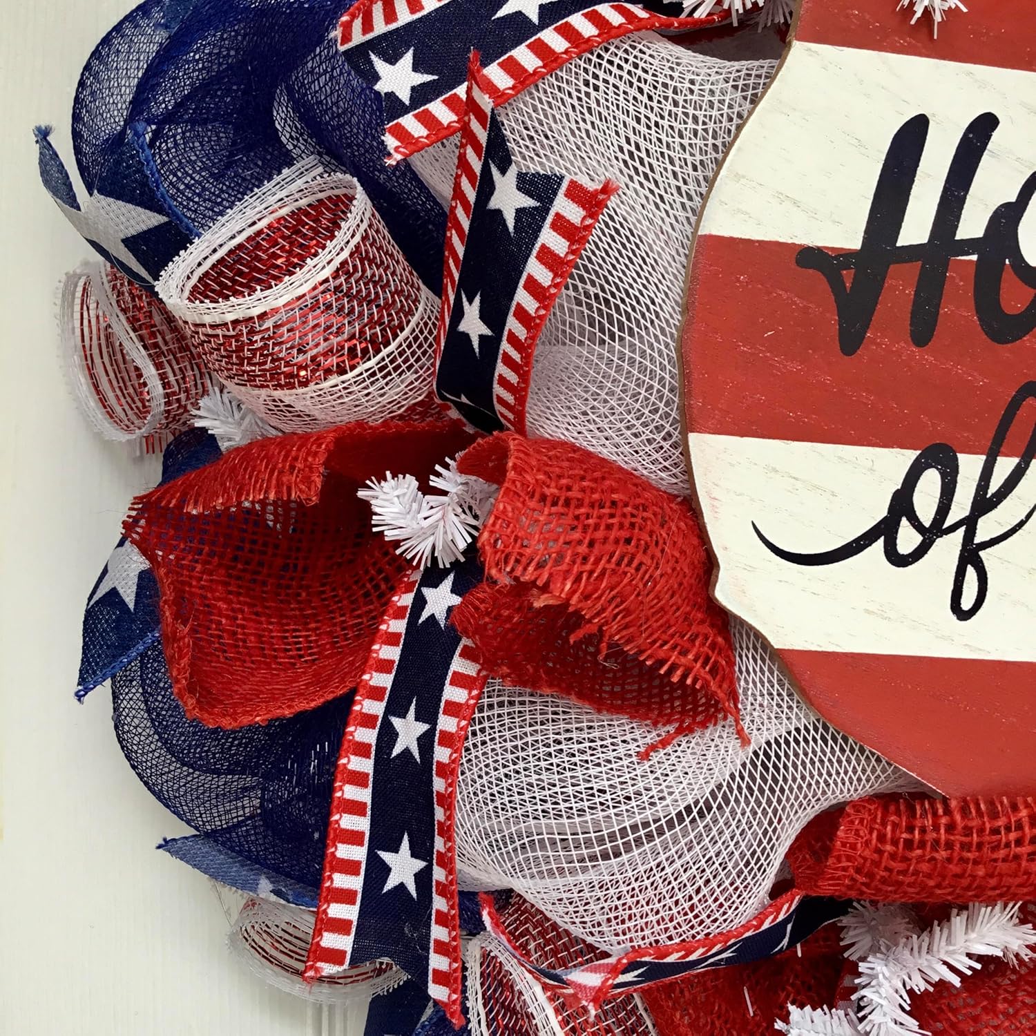 Beautiful, Large, Full, Premium, Handmade, Deco Mesh wreath. Featured in the center is a wood, American Flag shaped patriotic sign which says “Home of the free because of the brave.” The sign is decorated with red and white stripes. This wreath is great for Patriotic holidays. Made of durable mesh, the outer ring is navy blue and the inner ring is pure white. Red and white striped deco mesh flutes with navy blue star ribbons are placed along the exterior. Red, white and blue ribbons with stars, are placed along the center ring along with soft, red burlap.