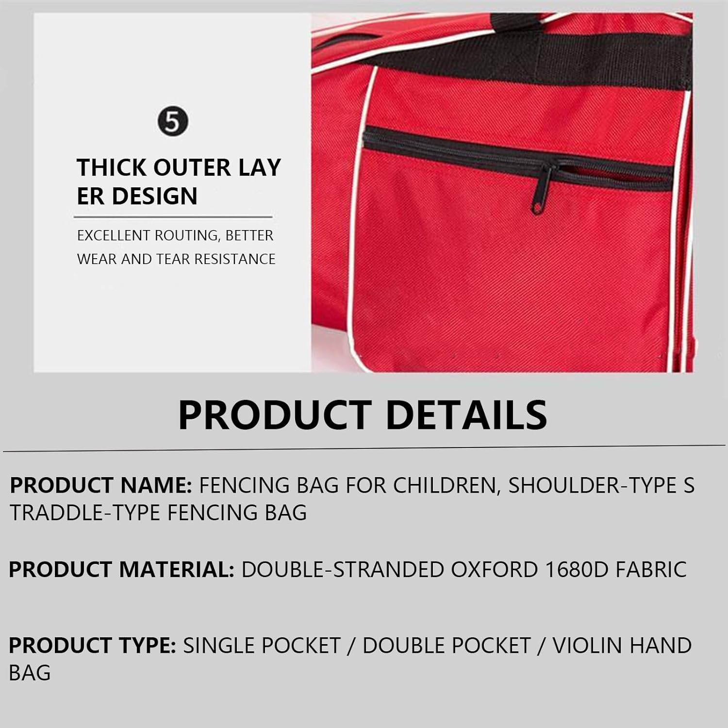 Product Description:Keep your fencing gear protected, organized, and easy to carry with this lightweight fencing sword bag, crafted from high-strength 1680D Oxford fabric. Designed for fencers of all levels, this bag offers durable water resistance, reinforced stitching, and ample space for storing your foil, epee, or sabre along with essential protective gear.The streamlined shape makes it ideal for daily training or club practice, while the comfortable carry handles ensure easy portability. A thickened outer layer provides added protection against impact and wear, and the dirt-resistant surface wipes clean in seconds—perfect for athletes on the go.Whether you're heading to class or preparing for a match, this fencing sword bag combines functionality and simplicity in one sleek solution.