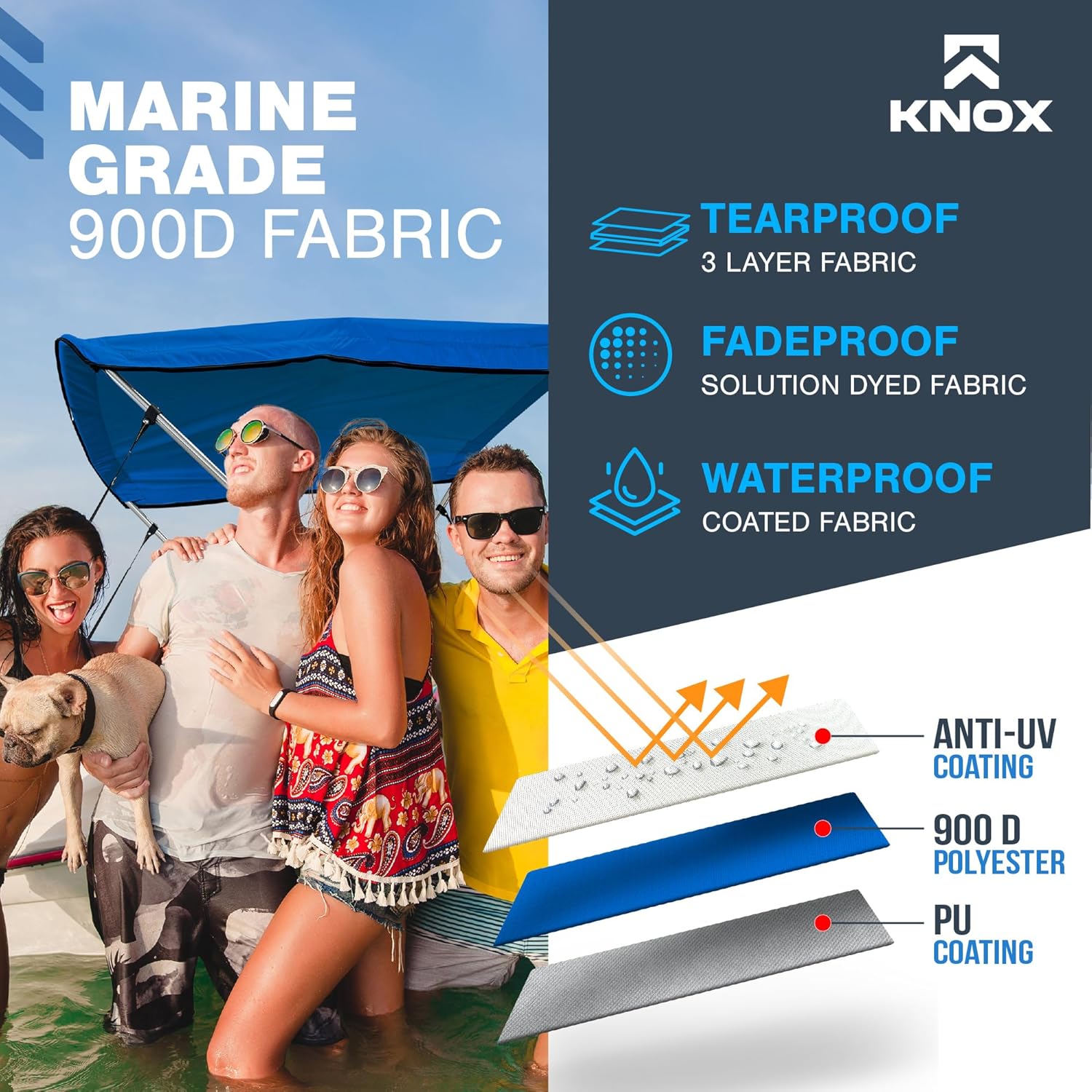 Features: [UNIVERSAL CANVAS REPLACEMENT] - KNOX’s 2 bow Bimini replacement canvas can be installed on any 2 pole Bimini top frame. Our 2 bow Bimini top canvas is designed to be applicable across a range of inflatable and hard-shell boats that are within 3.2–4.5 feet wide. [QUICK SWAP CANVAS] - With eight solution-dyed colors and quick swap design, our 2 bow replacement Bimini top canvas allows you to personalize your boat canopy cover in minutes. Go with bold colors, like our Bimini top 2 bow red shade, for fun occasions when you want to give off a party vibe. [NEVER FADES] - The boat cover material of our 2 bow boat canopy Bimini canvas is solution-dyed for high colorfastness. Solution dye allows our Bimini tops for jon boats to withstand heavy exposure to various elements without fading, retaining color vibrancy and pristine appearance for years. [IDEAL FOR INFLATABLE & ALUMINUM BOATS] - KNOX's 2 bow boat canopy provides the perfect boat shade for small-sized boats, like jon boats, V-Hulls, bass boats, row boats, pedal boats, dinghies and runabouts. Plus, it is designed to accommodate different boat build materials, such as PVC boat inflatable fabric, wood, plastic and aluminum. [INCLUDES ZIP-ON BIMINI TOP BOOT] - A matching colored Bimini cover boot is included with our 2-bow folding Bimini top cover. This allows for easy and compact storage of the paddle boat cover when not in use. Specifications: Canvas Material: 900D Oxford Polyester Bow Type: 2-Bow Size: 63" L x 43" H x 39"-55" W Brand: KNOX Color: Pacific Blue Condition: 100% Brand New Package Includes: 1x Bimini Top Canvas 1x Zippered Boot
