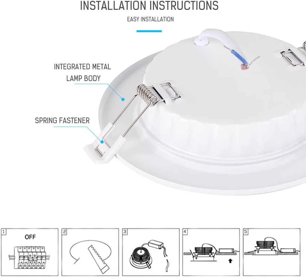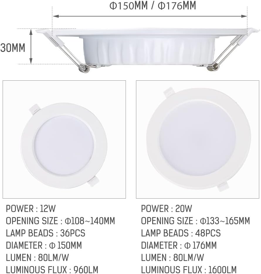 🤗Welcome Come🤗Hope you have a pleasant shopping experience!Product Specificationscolor whiteStyle: ModernShape of the lamp: RecessedIndoor and outdoor use: IndoorColor temperature: 3000K (warm white),6000K (Daylight white)Power: 12 watts, 20 wattsPower source: AC powerVoltage: 85-265 volts (AC)Special Features: No buzzing or flickering for eye comfortSwitch installation type: Ceiling mountLight source type: LEDShape: RoundDirection of light: downlightCRI: ≥80Viewing angle: 120 degrees12 watt mounting hole: Ø 108-140 mm/4.5-5 inch20 watt mounting hole: Ø 133-165 mm/5.5-6 inchCertifications: ETL,CE,RoHSLifespan: 30000 hoursUsage: Home/Commercial/IndustrialPackage: 8 x LED Downlight✅Customer service: If you have any questions, please contact us, we will reply to you within 12 hours and provide you with a satisfactory solution, we are honored to serve you.