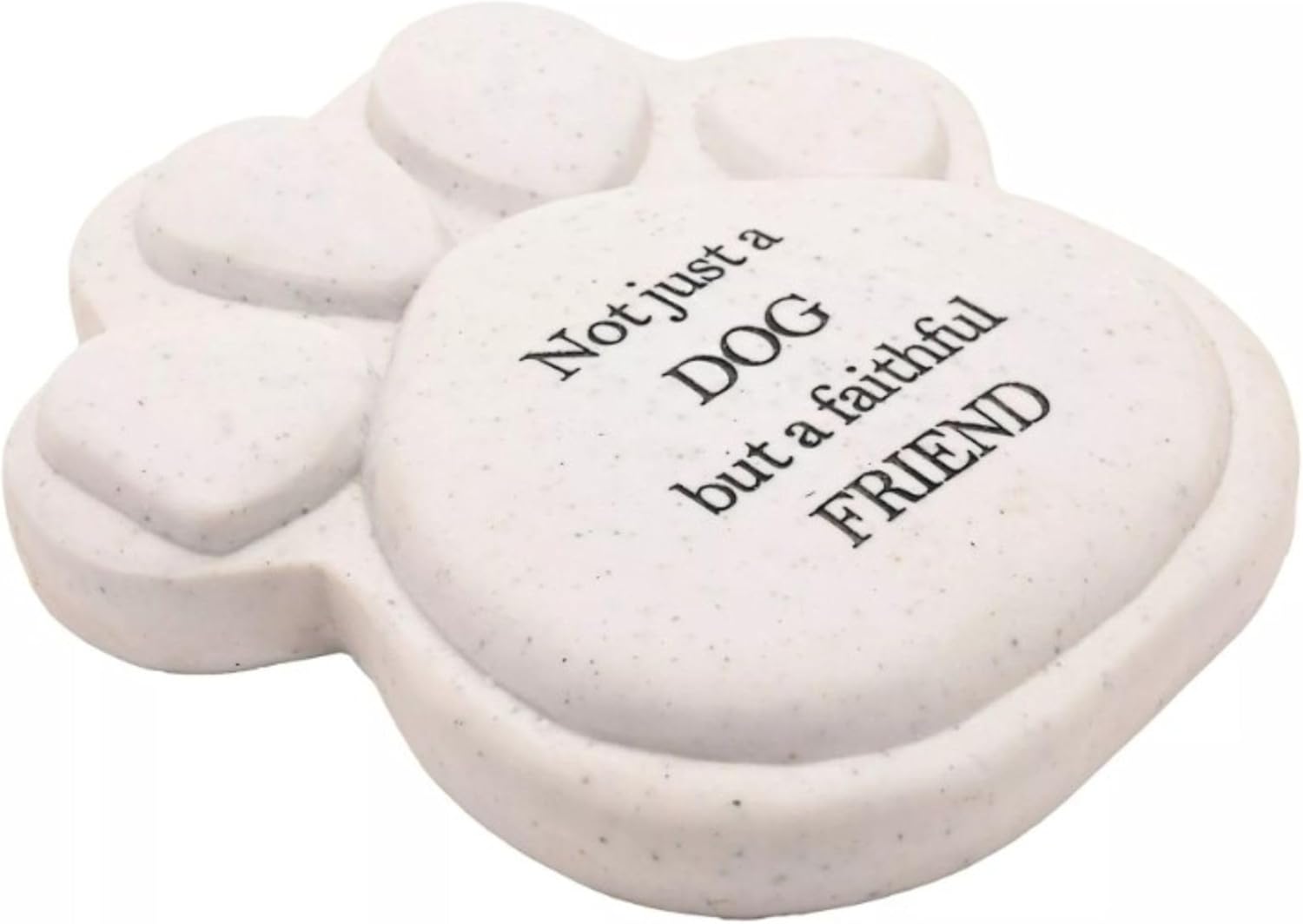 Remember a cherished companion with this heartfelt dog memorial plaque – a paw print-shaped ornament designed to honour the memory of a beloved pet. Crafted from durable, weatherproof resin, it’s suitable for outdoor placement at a graveside or garden memorial, as well as for indoor keepsake display. The plaque features a tender engraved message: “Not just a dog but a faithful friend” – a simple yet powerful tribute to the unconditional love and loyalty shared with a dearly missed pet. Measuring 205 x 195 x 35mm, this tasteful and discreet memorial makes a comforting addition to any remembrance space. Created by Widdop & Co – a trusted British giftware company since 1883 – this plaque reflects over a century of craftsmanship and care, offering a meaningful way to keep treasured memories close.